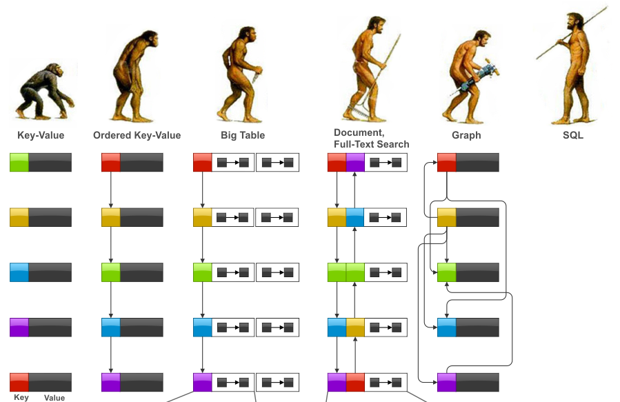 In terms of query language (and/or API) complexity, some may argue that the advancement of data-processing capabilities has an evolutional path, the below diagram (Diagram-4) outlines how NoSQLs compare with SQL-centric RDBMS. And the path is from: