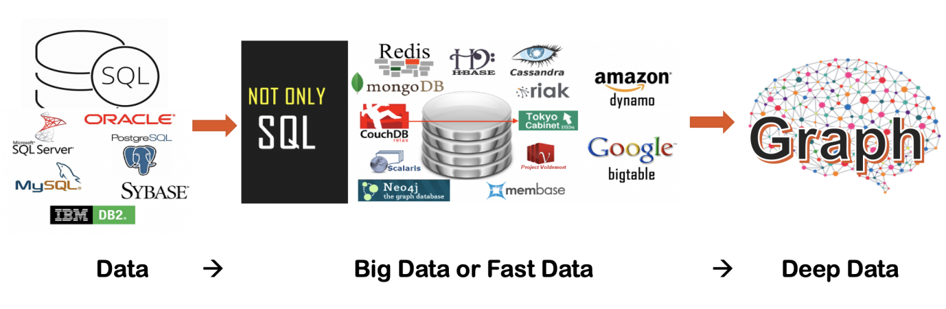 In Diagram-0, we have illustrated the industry-wide trend of moving from data to big-data then to fast data, so on and so forth. The underlying data-processing technologies are actually moving from relational databases to non-relational databases (NOSQLs and Hadoops), and to NewSQLs or graph database frameworks that are capable of big-data and fast data and even to the extent of deep data. This trend is captured in Diagram-2.