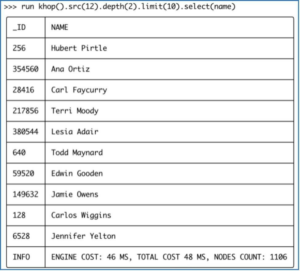 In Diagram-10-1, the khop() function is to search for vertices that are depth() away from the beginning node, and the select() function allows you to only return certain specified attributes.