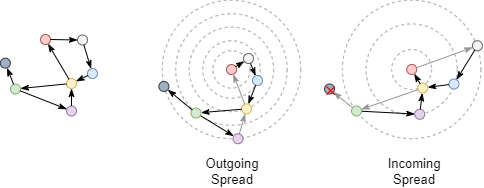 Calculate closeness centrality score of the red node in the incoming direction in the graph above. Only the blue, yellow and purple nodes can reach the red node in this direction, so the score is 3 / (2 + 1 + 2) = 0.6