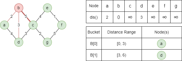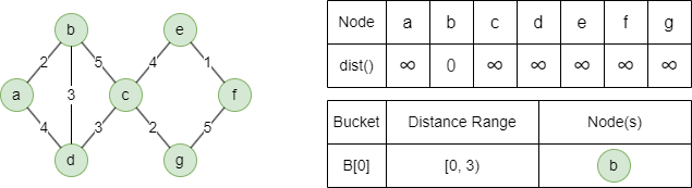 1. At the begining of the algorithm, all nodes are assigned an initial distance of infinity, except for the source node, which is set to 0. The source node is then placed into bucket B[0].
