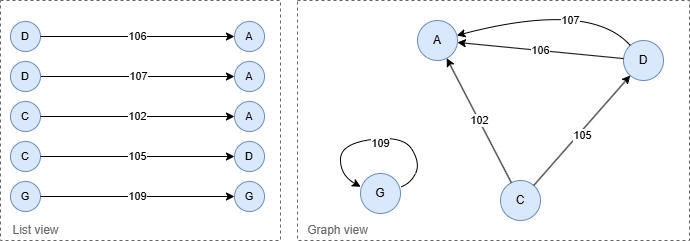 insert().into(@default).edges([{_from:"A", _to:"B", score:2}, {_from:"C", _to:"A", score:3}, {_from:"E", _to:"C", score:2}, {_from:"E", _to:"A", score:4}, {_from:"C", _to:"D", score:2}, {_from:"D", _to:"A", score:2}, {_from:"D", _to:"A", score:3}, {_from:"F", _to:"G", score:3}, {_from:"G", _to:"G", score:5}, {_from:"F", _to:"I", score:2}, {_from:"H", _to:"G", score:1}]);