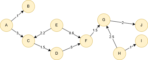 insert().into(@default).edges([{_from:"A", _to:"B", score:1}, {_from:"A", _to:"C", score:3}, {_from:"C", _to:"D", score:1.5}, {_from:"D", _to:"F", score:5}, {_from:"E", _to:"C", score:2.2}, {_from:"E", _to:"F", score:0.6}, {_from:"F", _to:"G", score:1.5}, {_from:"G", _to:"J", score:2}, {_from:"H", _to:"G", score:2.5}, {_from:"H", _to:"I", score:1}]);