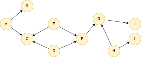 insert().into(@default).edges([{_from:"A", _to:"B"}, {_from:"A", _to:"C"}, {_from:"D", _to:"C"}, {_from:"D", _to:"F"}, {_from:"E", _to:"C"}, {_from:"E", _to:"F"}, {_from:"F", _to:"G"}, {_from:"G", _to:"J"}, {_from:"H", _to:"G"}, {_from:"H", _to:"I"}]);