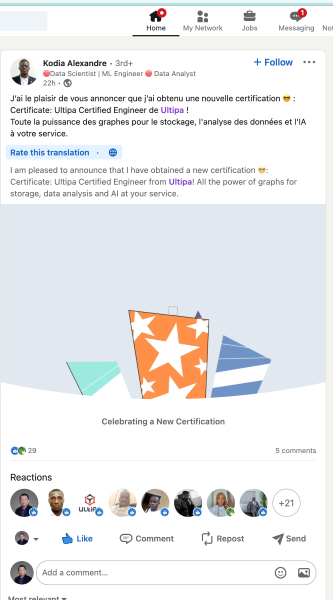 Kodia Alexandre and Adama Ilboudo successfully obtained the certificate after completing the courses Graph Fundamentals, Graph Database, Graph Algorithms, and UQL (Ultipa Graph Query Language) in the system and passing the exam. They excitedly expressed that this helped them understand graph and the applications of graph technology, and gave them more motivation to practise further and to move on to obtain the Ultipa Certified Professional.