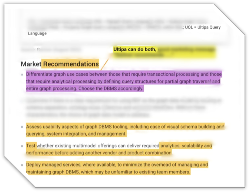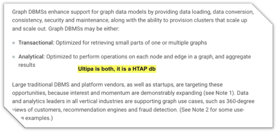 Gartner® finds that "GDBMS enhance support for graph database models by providing data loading, data conversion, consistency, security, and maintenance, along with the ability to provision clusters that scale up and scale out," and it elaborates on future databases’ development with Ultipa's HTAP (Hybrid Transaction Analytical Processing) architecture as an example (see image below).