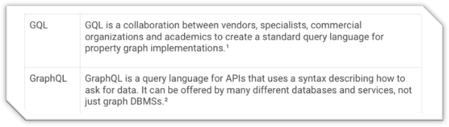 The characteristics above are explained in the documentations for GQL international standardization, and will not be elaborated here.