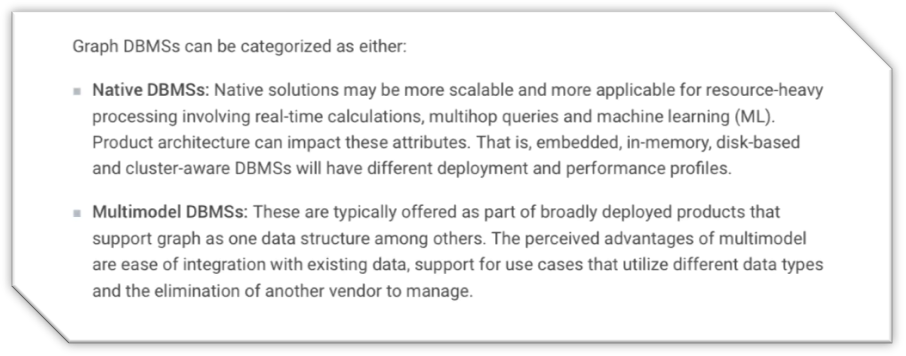 The Guide categorizes graph databases according to the underlying storage: Native DBMSs and Multi-model DBMS. Native graph databases are more capable of resource-intensive processing scenarios involving real-time computing, multi-hop queries, and machine learning (ML). ”——Gartner®。