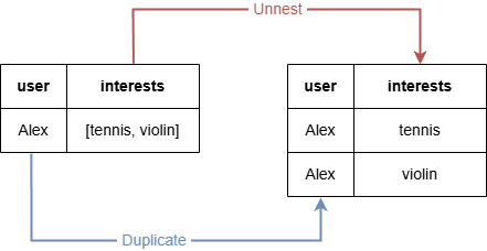 statement unnests a list into individual records and expands the intermediate result table accordingly.