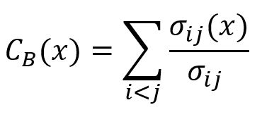 i and j are two distinct nodes in the graph, excluding x.σij is the total number of shortest paths between i and j.σij(x) is the number of shortest paths between i and j that pass through node x.σij(x)/σij gives the probability that x lies in the shortest paths between i and j. Note that if i and j are not connected, σij(x)/σij is 0.The final value is normalized by the factor (k – 1)(k – 2), where k is the total number of nodes in the graph. This normalization ensures the result lies within a fixed range, making it comparable across graphs of different sizes.