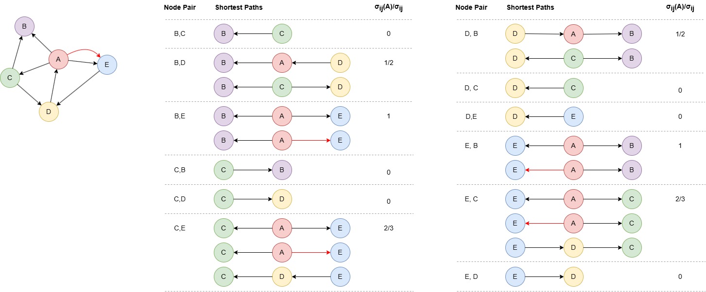 The betweenness centrality of node A is computed as: (1/2 + 1 + 2/3 + 1/2 + 1 + 2/3) / (4 * 3) = 0.3611111111.