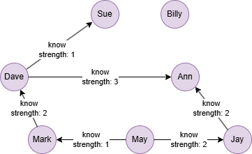 GQLINSERT (Sue:user {_id: "Sue"}), (Dave:user {_id: "Dave"}), (Ann:user {_id: "Ann"}), (Mark:user {_id: "Mark"}), (May:user {_id: "May"}), (Jay:user {_id: "Jay"}), (Billy:user {_id: "Billy"}), (Dave)-[:know {strength: 1}]->(Sue), (Dave)-[:know {strength: 3}]->(Ann), (Mark)-[:know {strength: 2}]->(Dave), (May)-[:know {strength: 1}]->(Mark), (May)-[:know {strength: 2}]->(Jay), (Jay)-[:know {strength: 2}]->(Ann)