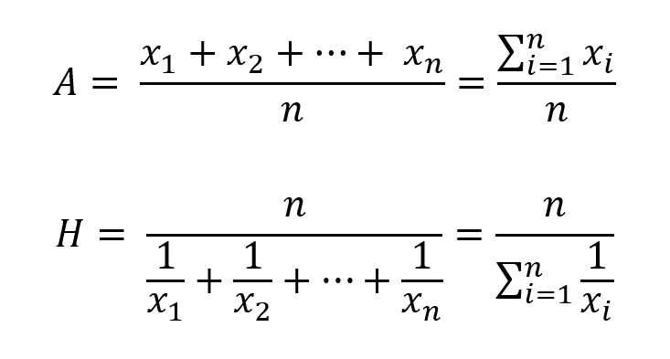 The harmonic mean is the reciprocal of the arithmetic mean of the reciprocals of the variables. The formula for calculating the arithmetic mean A and the harmonic mean H is as follows:
