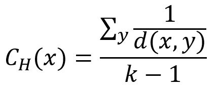 where x is the target node, y is any node in the graph other than x, k-1 is the number of y, d(x,y) is the shortest distance between x and y, d(x,y) = +∞ when x and y are not reachable to each other, in this case 1/d(x,y) = 0.
