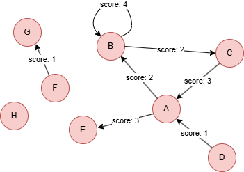 GQLINSERT (A:user {_id: "A"}), (B:user {_id: "B"}), (C:user {_id: "C"}), (D:user {_id: "D"}), (E:user {_id: "E"}), (F:user {_id: "F"}), (G:user {_id: "G"}), (H:user {_id: "H"}), (A)-[:vote {score: 2}]->(B), (A)-[:vote {score: 3}]->(E), (B)-[:vote {score: 4}]->(B), (B)-[:vote {score: 2}]->(C), (C)-[:vote {score: 3}]->(A), (D)-[:vote {score: 1}]->(A), (F)-[:vote {score: 1}]->(G)
