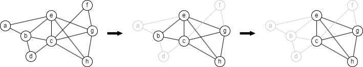 Below is the pruning process to get the 3-core of the graph. In the first round, nodes {a, d, f} with degree less than 3 are removed, which then affects the removal of node b in the second round. After the second round, all remaining nodes have a degree of at least 3. Therefore, the pruning process ends, and the 3-core of this graph is induced by nodes {c, e, g, h}.