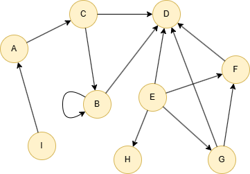 GQLINSERT (A:default {_id: "A"}), (B:default {_id: "B"}), (C:default {_id: "C"}), (D:default {_id: "D"}), (E:default {_id: "E"}), (F:default {_id: "F"}), (G:default {_id: "G"}), (H:default {_id: "H"}), (I:default {_id: "I"}), (A)-[:default]->(C), (B)-[:default]->(B), (B)-[:default]->(D), (C)-[:default]->(B), (C)-[:default]->(D), (E)-[:default]->(D), (E)-[:default]->(F), (E)-[:default]->(G), (E)-[:default]->(H), (F)-[:default]->(D), (G)-[:default]->(D), (G)-[:default]->(F), (I)-[:default]->(A)