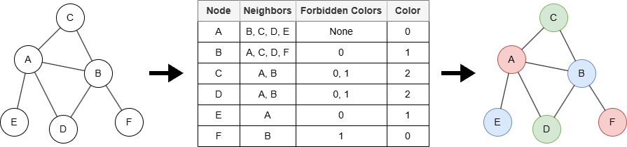 At the beginning of the greedy algorithm, each node v in the graph is initialized as uncolored. The algorithm processes each node v as below: