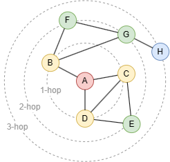 In this graph, nodes {B, C, D} are the 1-hop neighbors of node A, {E, F, G} are the 2-hop neighbors, and {H} is the 3-hop neighbor.