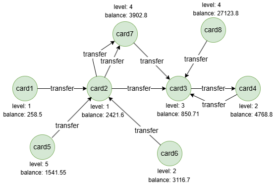 GQLINSERT (card1:card {_id: "card1"}), (card2:card {_id: "card2"}), (card3:card {_id: "card3"}), (card4:card {_id: "card4"}), (card5:card {_id: "card5"}), (card6:card {_id: "card6"}), (card7:card {_id: "card7"}), (card8:card {_id: "card8"}), (card1)-[:transfer]->(card2), (card2)-[:transfer]->(card3), (card2)-[:transfer]->(card7), (card2)-[:transfer]->(card7), (card3)-[:transfer]->(card4), (card4)-[:transfer]->(card3), (card5)-[:transfer]->(card2), (card6)-[:transfer]->(card2), (card7)-[:transfer]->(card3), (card8)-[:transfer]->(card3)