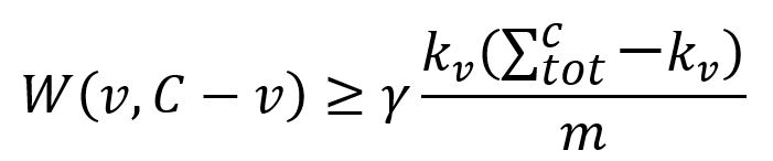 W(v,C-v) is the sum of edge weights between node v and the other nodes in C.kv is the total edge weights between node v and the other nodes in the graph. is the sum of k of all nodes in C.m is the sum of all edge weights in the graph.