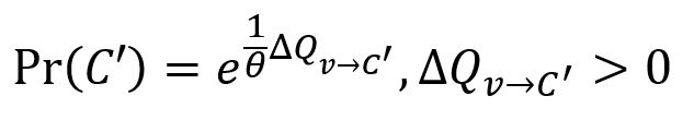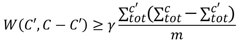 Note that each node v is not necessarily merged greedily with the community that yields the maximum gain of modularity. Instead, the larger the modularity gain, the more likely that community is to be selected. The degree of randomness in selecting a community C' is determined by a parameter θ (theta) as: