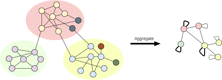 P is denoted by color blocks, Prefined is denoted by node colorsOnce this third phase is completed, another pass is applied to the aggregate graph. These passes are iterated until no further changes occur in the node communities, and the modularity reaches its maximum.