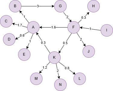 GQLINSERT (A:default {_id: "A"}), (B:default {_id: "B"}), (C:default {_id: "C"}), (D:default {_id: "D"}), (E:default {_id: "E"}), (F:default {_id: "F"}), (G:default {_id: "G"}), (H:default {_id: "H"}), (I:default {_id: "I"}), (J:default {_id: "J"}), (K:default {_id: "K"}), (L:default {_id: "L"}), (M:default {_id: "M"}), (N:default {_id: "N"}), (A)-[:default {weight: 1}]->(B), (A)-[:default {weight: 1.7}]->(C), (A)-[:default {weight: 0.6}]->(D), (A)-[:default {weight: 1}]->(E), (B)-[:default {weight: 3}]->(G), (F)-[:default {weight: 1.6}]->(A), (F)-[:default {weight: 0.3}]->(H), (F)-[:default {weight: 2}]->(J), (F)-[:default {weight: 0.5}]->(K), (G)-[:default {weight: 2}]->(F), (I)-[:default {weight: 1}]->(F), (K)-[:default {weight: 0.3}]->(A), (K)-[:default {weight: 0.8}]->(L), (K)-[:default {weight: 1.2}]->(M), (K)-[:default {weight: 2}]->(N)