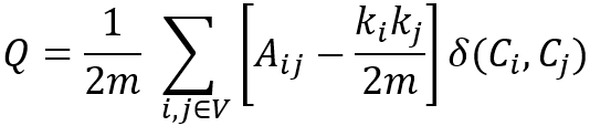 m is the total sum of edge weights in the graph;Aij is the sum of edge weights between nodes i and j, and 2m = ∑ijAij;ki is the sum of weights of all edges attached to node i;Ci represents the community to which node iis assigned, δ(Ci,Cj) is 1 if Ci= Cj, and 0 otherwise.Note, is the expected sum of weights of edges between nodes i and j if edges are placed at random. Both Aij and are divided by 2m because each pair of distinct nodes in a community is considered twice, such as Aab = Aba, .