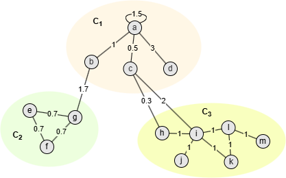 ∑ in c is the sum of weights of edges inside community C, i.e., the intra-community weight;∑ tot c is the sum of weights of edges incident to nodes in community C, i.e, the total-community weight;m has the same meaning as above, and 2m = ∑c∑ tot c .