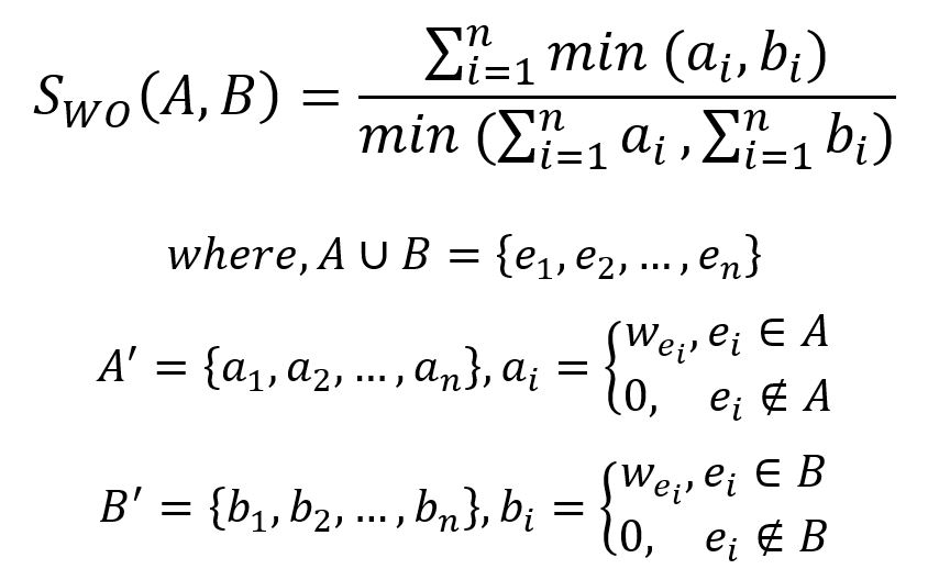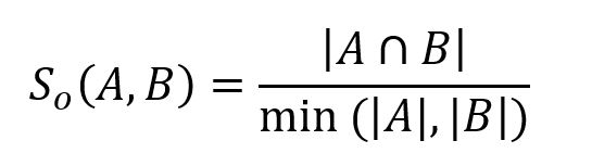 Overlap similarity is derived from Jaccard similarity, which is also called the Szymkiewicz–Simpson coefficient. It divides the size of the intersection of two sets by the size of the smaller set with the purpose to indicate how similar the two sets are.