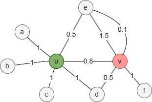 In this weighted graph, the union of the 1-hop neighborhood sets Nu and Nv is {a,b,c,d,e,f}. For each element in the union set, assign a value equal to the sum of the edge weights between the target node and the corresponding node; assign 0 if no edge exists between them: