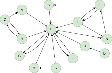 GQLINSERT (A:account {_id: "A"}), (B:account {_id: "B"}), (C:account {_id: "C"}), (D:account {_id: "D"}), (E:account {_id: "E"}), (F:account {_id: "F"}), (G:account {_id: "G"}), (H:account {_id: "H"}), (I:account {_id: "I"}), (J:account {_id: "J"}), (K:account {_id: "K"}), (L:account {_id: "L"}), (M:account {_id: "M"}), (N:account {_id: "N"}), (A)-[:follow]->(E), (B)-[:follow]->(E), (C)-[:follow]->(A), (C)-[:follow]->(H), (D)-[:follow]->(J), (E)-[:follow]->(G), (E)-[:follow]->(G), (E)-[:follow]->(I), (E)-[:follow]->(N), (F)-[:follow]->(L), (F)-[:follow]->(B), (H)-[:follow]->(C), (H)-[:follow]->(E), (I)-[:follow]->(E), (J)-[:follow]->(E), (K)-[:follow]->(E), (K)-[:follow]->(M), (L)-[:follow]->(E), (L)-[:follow]->(F), (L)-[:follow]->(N), (M)-[:follow]->(E), (N)-[:follow]->(F)