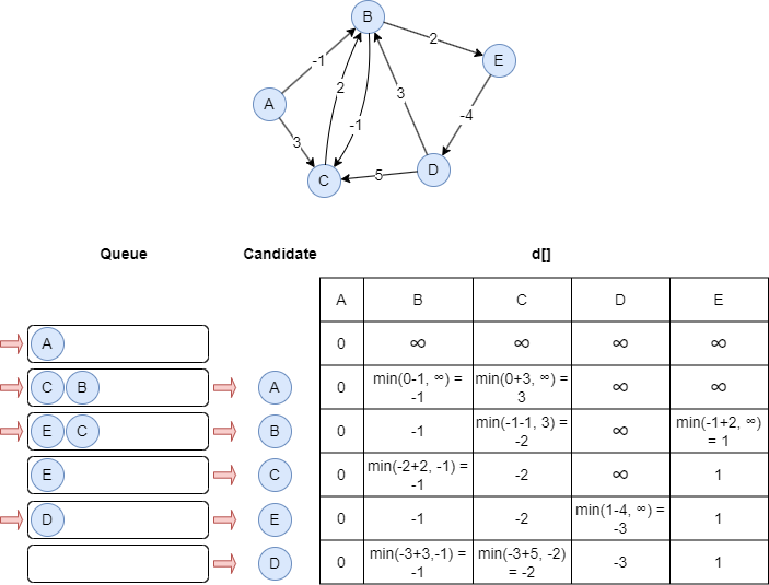 The basic idea of SPFA is the same as the Bellman–Ford algorithm in that each node is used as a candidate to update distance for its adjacent nodes. However, SPFA improves efficiency by avoiding unnecessary iterations over all nodes. Instead, it maintains a first-in, first-out queue Q to store candidate nodes, and a node is added to the queue only when it has been updated.
