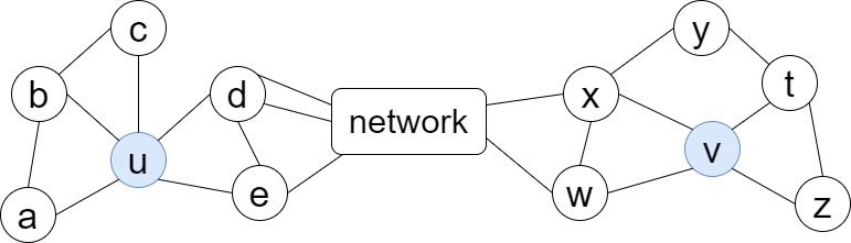 As illustrated here, nodes u and v are structurally similar—they have degrees of 5 and 4, are connected to 3 and 2 triangles respectively, and each connects to the rest of the network through 2 nodes. Despite not sharing a direct link or common neighbor, and possibly being far apart in the graph, they still exhibit similar structural roles.