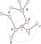 {a, b, c} with degrees [2, 2, 3]{d, e, f, g} with degrees [1, 1, 2, 4]The histogram counts nodes at each (hop, degree) combination:
