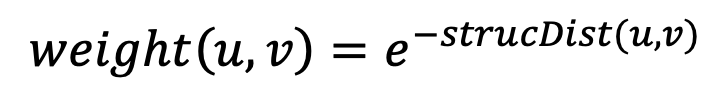 Nodes with smaller structural distance (more similar topology) get higher edge weights. These weights guide the random walks toward structurally similar neighbors.