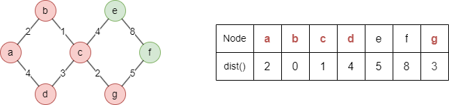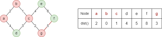 dist(a) = min(0+2,∞) = 2, dist(c) = min(0+1,∞) = 1