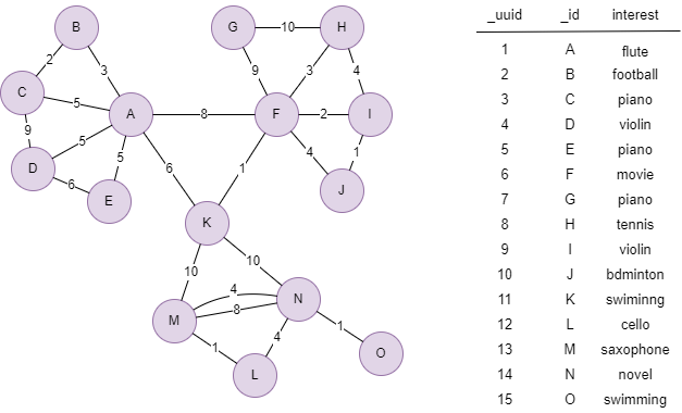 The example graph is as follows, nodes are of schema user, edges are of schema connect, the value of @connect.strength is shown in the graph:
