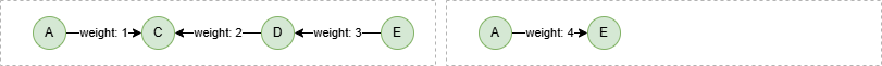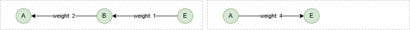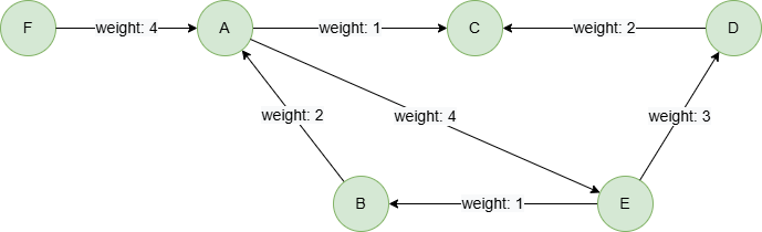 insert().into(@default).edges([{_from:"A", _to:"C", weight:1}, {_from:"E", _to:"B", weight:1}, {_from:"A", _to:"E", weight:4}, {_from:"D", _to:"C", weight:2}, {_from:"E", _to:"D", weight:3}, {_from:"B", _to:"A", weight:2}, {_from:"F", _to:"A", weight:4}])
