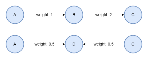 insert().into(@link).edges([{_from:"A", _to:"B", weight:1},{_from:"A", _to:"C", weight:1.5},{_from:"A", _to:"D", weight:0.5},{_from:"B", _to:"C", weight:2},{_from:"C", _to:"D", weight:0.5}]);