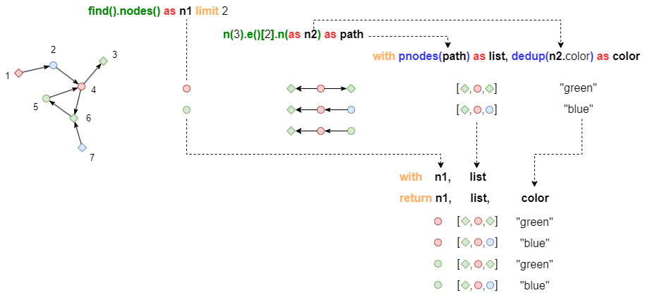 For instance, the deduplication against n2.color affects its homologous alias pnodes(path); the Cartesian multiplication against heterologous aliases n1 and list also affects color, the homologous alias of list: