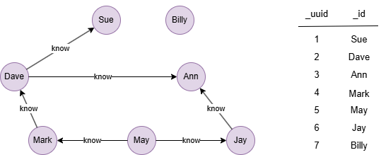 The example graph is a small social network, nodes represent users, and edges represent the relationship of know: