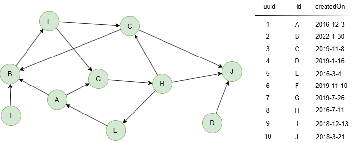 Results: table(nodes._id, nodes.createdOn, seeds.spread)