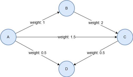 GQLALTER GRAPH CURRENT_GRAPH ADD NODE { entity () }; ALTER GRAPH CURRENT_GRAPH ADD EDGE { link ()-[{weight float}]->() }; INSERT (A:entity {_id: "A"}), (B:entity {_id: "B"}), (C:entity {_id: "C"}), (D:entity {_id: "D"}), (A)-[:link {weight: 1}]->(B), (A)-[:link {weight: 1.5}]->(C), (A)-[:link {weight: 0.5}]->(D), (B)-[:link {weight: 2}]->(C), (C)-[:link {weight: 0.5}]->(D);