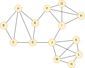 insert().into(@default).edges([{_from:"A", _to:"B"}, {_from:"B", _to:"C"}, {_from:"A", _to:"C"}, {_from:"A", _to:"D"}, {_from:"A", _to:"E"}, {_from:"C", _to:"D"}, {_from:"E", _to:"D"}, {_from:"E", _to:"F"}, {_from:"D", _to:"J"}, {_from:"F", _to:"G"}, {_from:"F", _to:"I"}, {_from:"G", _to:"H"}, {_from:"F", _to:"H"}, {_from:"G", _to:"I"}, {_from:"H", _to:"I"}, {_from:"I", _to:"J"}, {_from:"J", _to:"K"}, {_from:"J", _to:"M"}, {_from:"K", _to:"L"}, {_from:"J", _to:"L"}, {_from:"M", _to:"K"}, {_from:"M", _to:"L"}, {_from:"M", _to:"N"}, {_from:"N", _to:"L"}]);