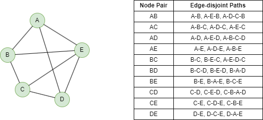Below shows a 3-edge connected graph and the edge-disjoint paths between each node pair.