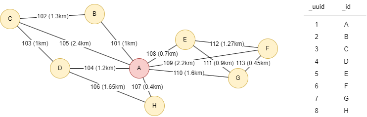 The example graph is as below, node A is an electric center, node B~H are the surrounding villages. Each edge is labeled with its UUID and the distance between the connected locations, which represents the required cable length: