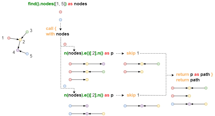 CALL executes operations against the query result of each subquery, NOT all the result of a query command. It wraps query commands and the operations in curly braces {}, passes in the alias that triggers each subquery using a WITH clause and passes out the result of each subquery using a RETURN clause.