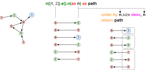 Example: Find 1-step paths @course-@student, order the results into ascending credit of course, then into descending age of student